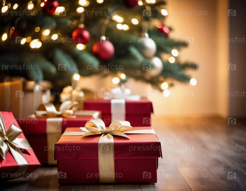 Уютная гостиная, украшенная праздничной рождественской елкой, украшенной сверкающими огнями и красочными безделушками, окруженная множеством тщательно упакованных подарочных коробок, ожидающих открытия. Искусство ИИ
