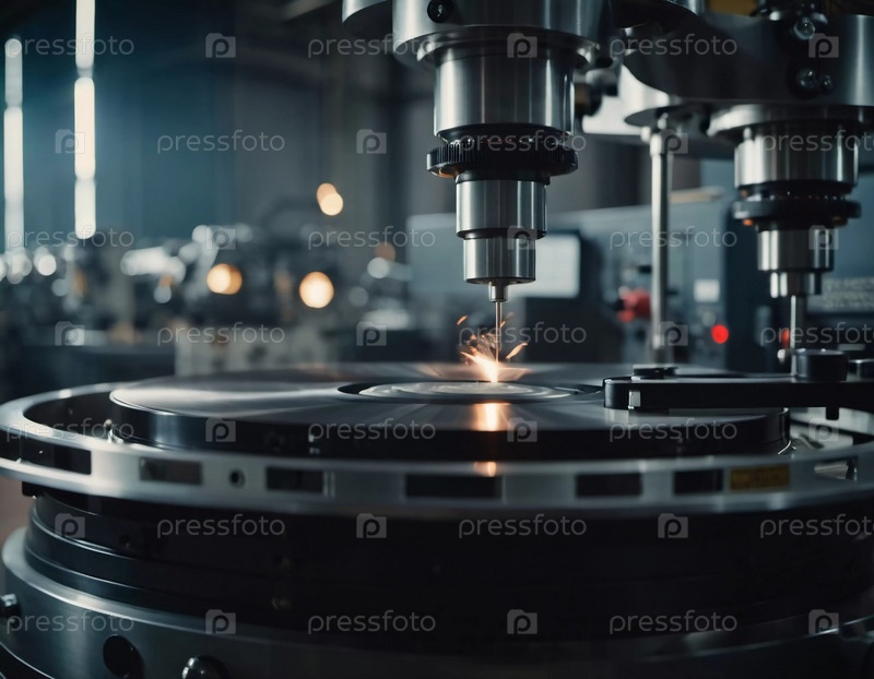 Производственное предприятие демонстрирует передовые процессы фрезерования с использованием станка, создающего сложные детали, подчеркивая инженерную точность и эффективность. Генеративный ИИ