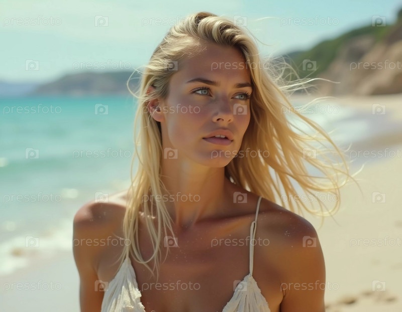 Блондинка стоит на берегу океана или моря, наслаждаясь солнцем и серфингом, одета в стильный купальник, подчеркивая расслабленную пляжную атмосферу. Красивое молодое лицо. Реклама для одежды или пляжного путешествия. AI
