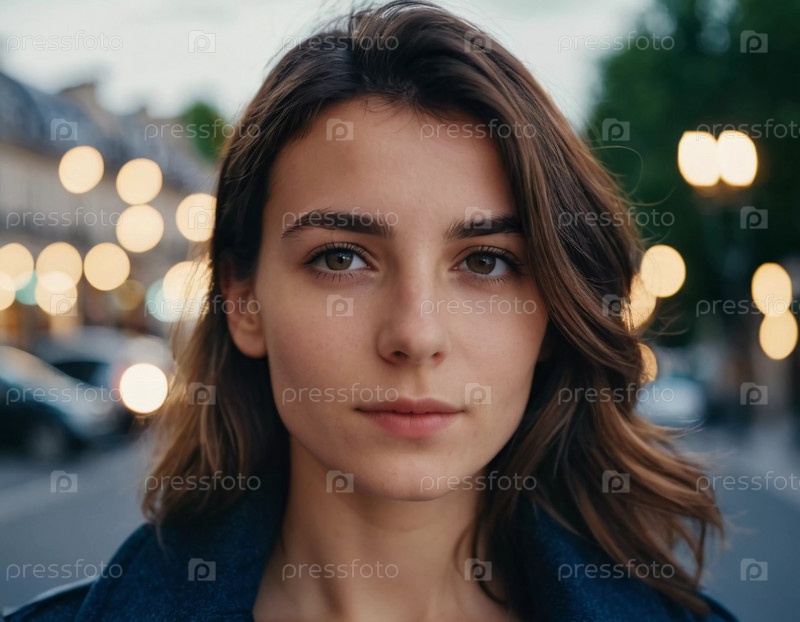 Молодая брюнетка 25 лет уверенно стоит на парижской улице в сумерках, мягкие городские огни освещают ее нежные черты, отражая спокойствие и городское очарование. Генеративный ИИ