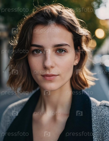 Молодая брюнетка 25 лет уверенно стоит на парижской улице в сумерках, мягкие городские огни освещают ее нежные черты, отражая спокойствие и городское очарование. Генеративный ИИ