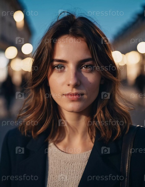 Молодая брюнетка 25 лет уверенно стоит на парижской улице в сумерках, мягкие городские огни освещают ее нежные черты, отражая спокойствие и городское очарование. Генеративный ИИ