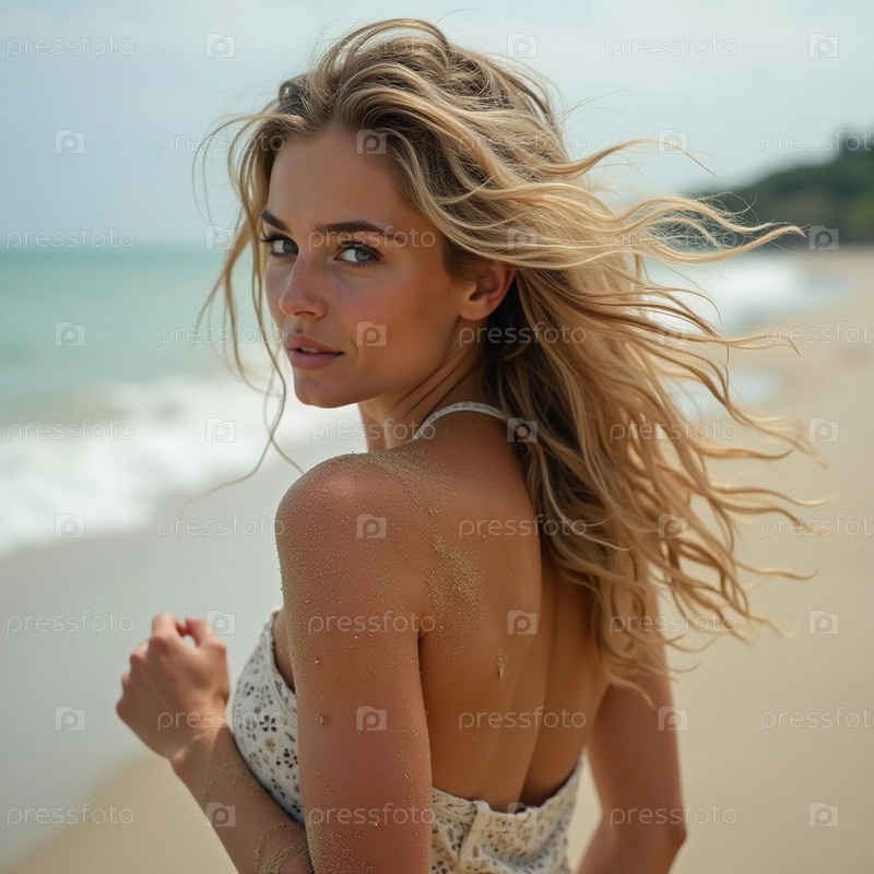 Блондинка в купальнике оглядывается назад, стоя у береговой линии. Нежные морские волны пляшут у ее ног под ясно-синим небом. Длинные волосы, красивое молодое лицо. Реклама путешествий и одежды. AI