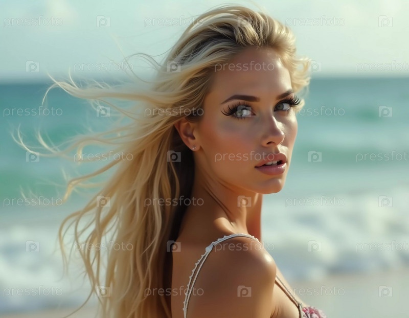 Блондинка в купальнике оглядывается назад, стоя у береговой линии. Нежные морские волны пляшут у ее ног под ясно-синим небом. Длинные волосы, красивое молодое лицо. Реклама путешествий и одежды. AI