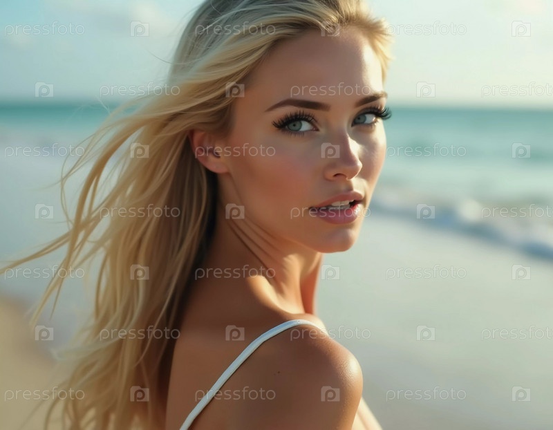 Блондинка в купальнике оглядывается назад, стоя у береговой линии. Нежные морские волны пляшут у ее ног под ясно-синим небом. Длинные волосы, красивое молодое лицо. Реклама путешествий и одежды. AI