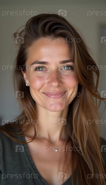 Улыбающаяся молодая красивая женщина кавказской внешности из Франции, воплощающая тепло и радость. Ее расслабленное поведение и беззаботное выражение лица передают ощущение счастья и доступности. Генеративный ИИ