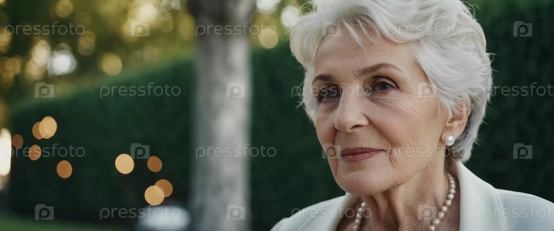 Утонченная пожилая француженка на открытом воздухе. манера поведения раскрывает жизненный опыт и размышления, воплощая изящество и мудрость. ухоженная женщина 70 лет с седыми волосами
