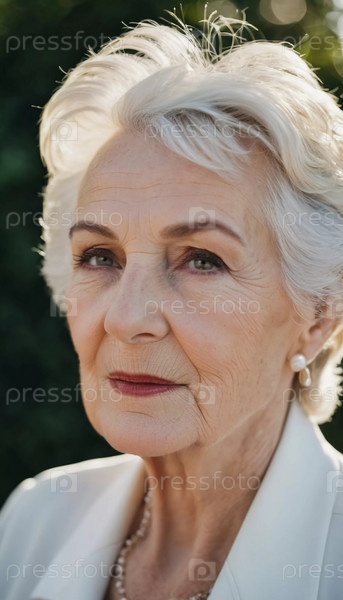 Утонченная пожилая француженка на открытом воздухе. манера поведения раскрывает жизненный опыт и размышления, воплощая изящество и мудрость. ухоженная женщина 70 лет с седыми волосами