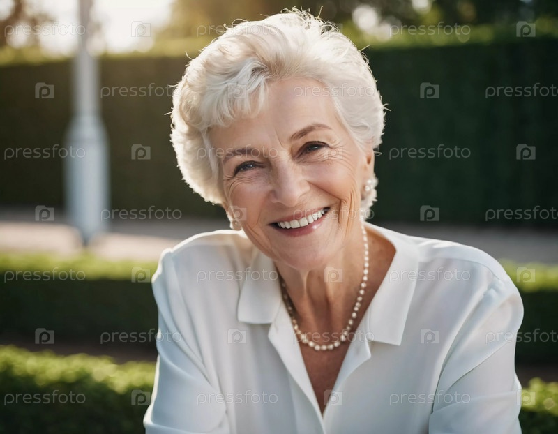 Утонченная улыбающаяся пожилая француженка на открытом воздухе. манера поведения раскрывает жизненный опыт и размышления, воплощая изящество и мудрость. ухоженная женщина 70 лет с седыми волосами