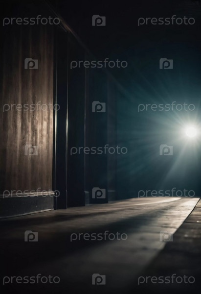 Впереди тянется темный коридор, освещенный слабым верхним светом, который создает зловещие тени на деревянном полу, создавая леденящую атмосферу. Генеративный ИИ
