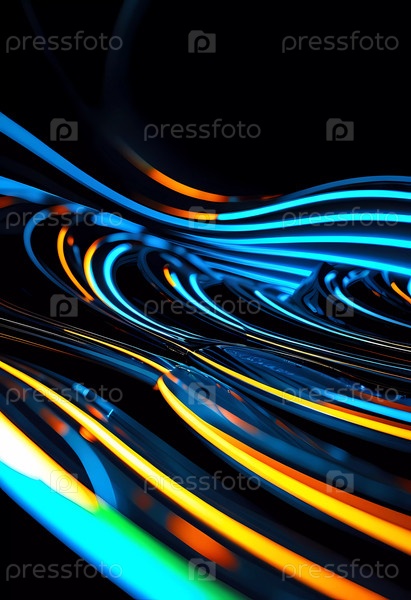 Текучие плавные линии, переплетающиеся на глубоком черном фоне, обогащенные яркими цветами и захватывающим эффектом боке, привлекающим внимание. Динамичные световые следы в серо-голубых и желтых тонах. Генеративный ИИ