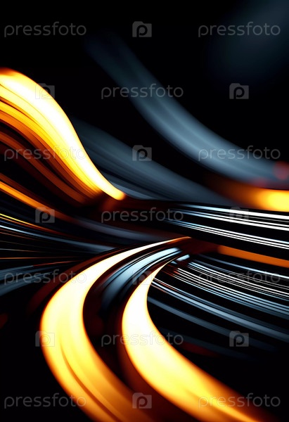 Текучие плавные линии, переплетающиеся на глубоком черном фоне, обогащенные яркими цветами и захватывающим эффектом боке, привлекающим внимание. Динамичные световые следы в серо-голубых и желтых тонах. Генеративный ИИ