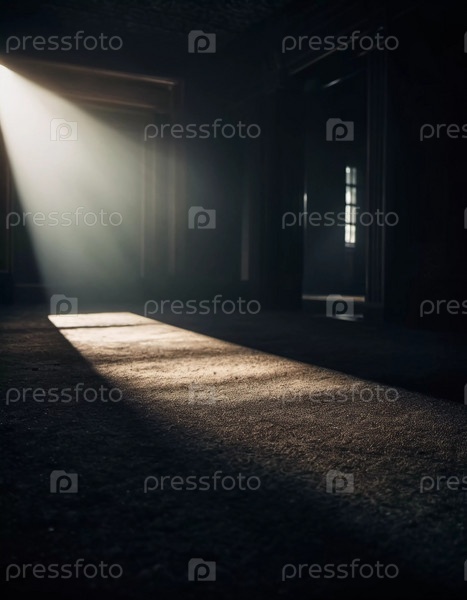 Впереди тянется темный коридор, освещенный слабым верхним светом, который создает зловещие тени на деревянном полу, создавая леденящую атмосферу. Генеративный ИИ