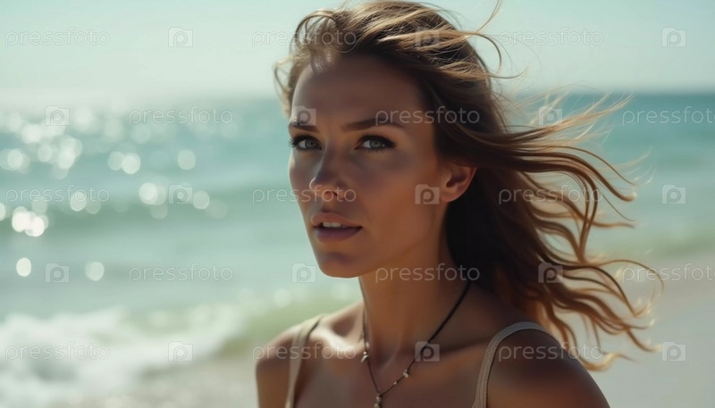 Брюнетка стоит на берегу океана или моря, наслаждаясь солнцем и приливом, одета в стильный купальник, подчеркивая расслабленную атмосферу пляжа. Красивое молодое лицо. Реклама путешествий или одежды. AI
