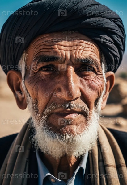 Пожилой мужчина из Афганистана демонстрирует свое обветренное лицо, отражающее годы мудрости и стойкости на скромном фоне природы, олицетворяя богатую культуру его родины. Генеративный ИИ