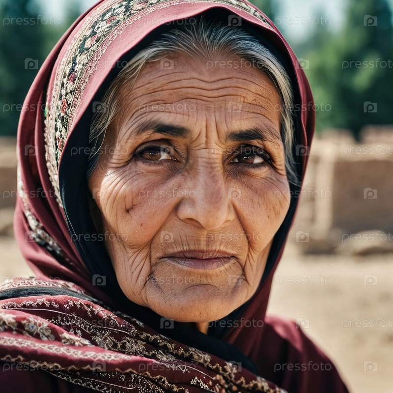 Пожилая афганская женщина 75 лет задумчиво смотрит вдаль, ее лицо отмечено жизненным опытом. Она носит традиционный платок на деревенском фоне. Генеративный ИИ