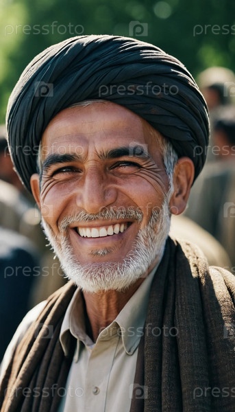 Житель Афганистана, этот улыбающийся человек излучает тепло и счастье, демонстрируя богатое культурное наследие и принимая жизнь