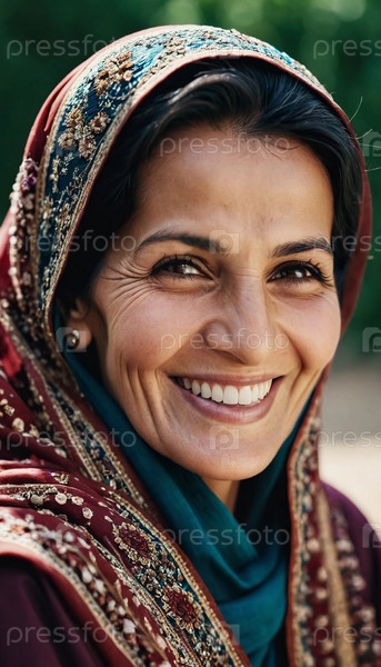 Радостная женщина 45 лет из Афганистана демонстрирует яркую улыбку, одетая в традиционную одежду. Она стоит уверенно, воплощая чувство мира в своей сельской общине. Генеративный ИИ