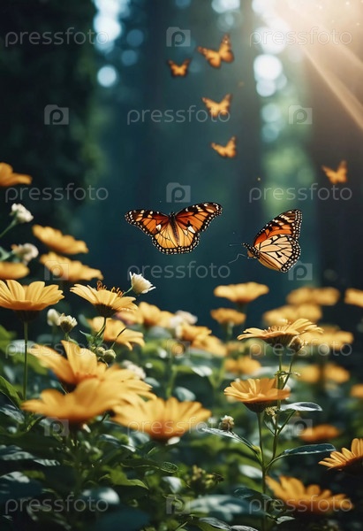 Группа ярких бабочек грациозно танцует вокруг цветущих цветов в красочном саду. Яркие цветы создают живую атмосферу под теплым солнечным светом. Генеративный ИИ