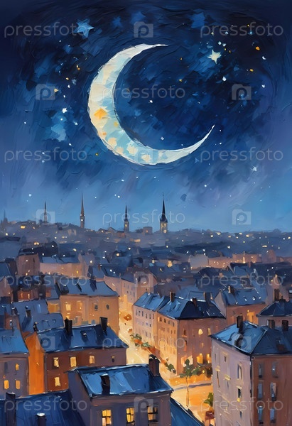 Золотые огни мерцают на крышах домов, полумесяц и россыпи звезд освещают безмятежное ночное небо над прекрасным городским пейзажем. Генеративный ИИ