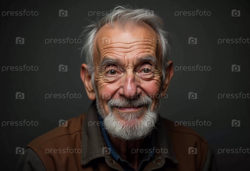 Пожилой мужчина стоит уверенно, одетый в черную куртку. Мягко освещенный фон. Портрет русского мужчины, 60-70-80 лет. Серьезное, мудрое, вдумчивое лицо. Пенсионер с седыми волосами. Генеративный ИИ