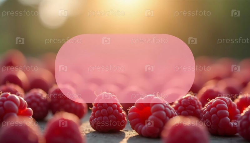 Зрелые ягоды малины представлены на округлом полупрозрачном фоне и с мягким эффектом боке, создающим мечтательную атмосферу.Упаковка для чая, джема или косметики с ароматом малины