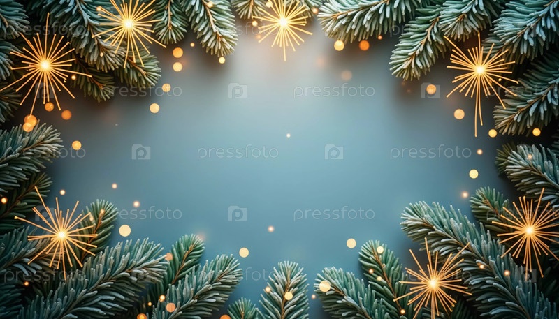 Еловые ветки обрамляют спокойный голубой фон, украшенный золотыми украшениями и звездами, создавая теплую, уютную атмосферу, идеально подходящую для праздничных торжеств и праздников. Генеративный ИИ