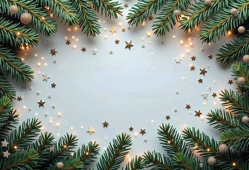 Еловые ветки обрамляют спокойный голубой фон, украшенный золотыми украшениями и звездами, создавая теплую, уютную атмосферу, идеально подходящую для праздничных торжеств и праздников. Генеративный ИИ