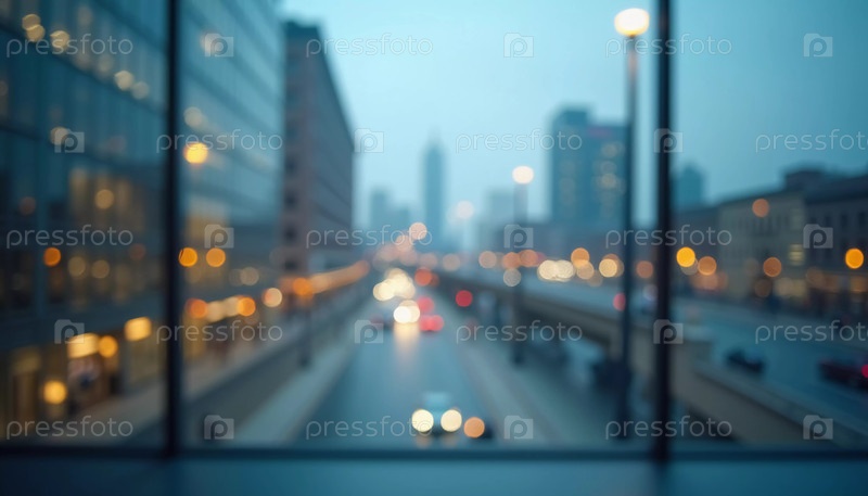 Размытая перспектива демонстрирует современный городской горизонт через стеклянную стену в сумерках, раскрывая яркость и сложность городской жизни. Угасающий свет отражает городскую энергию. Генеративный ИИ