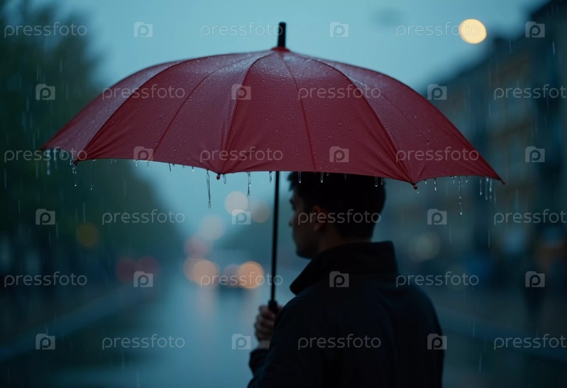 Человек держит красный зонтик, идя по мокрой городской улице во время дождя. Отражения огней и зданий создают угрюмую атмосферу, пока они пробираются сквозь дождь. Генеративный ИИ