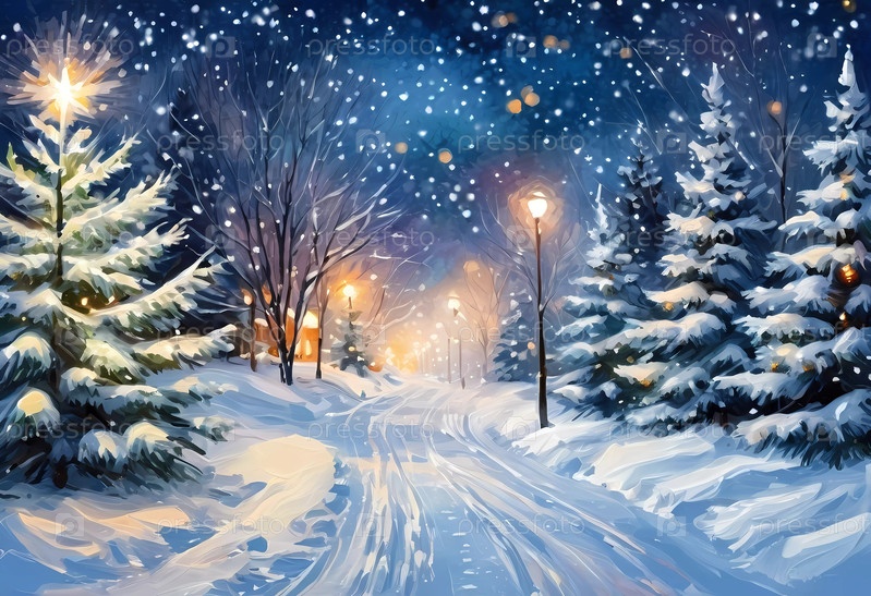 В тихую снежную ночь мягкие рождественские огни боке украшают еловые ветки на фоне живописного пейзажа. Видны уютные дома, излучающие тепло и праздник в зимней сказке. Генеративный ИИ