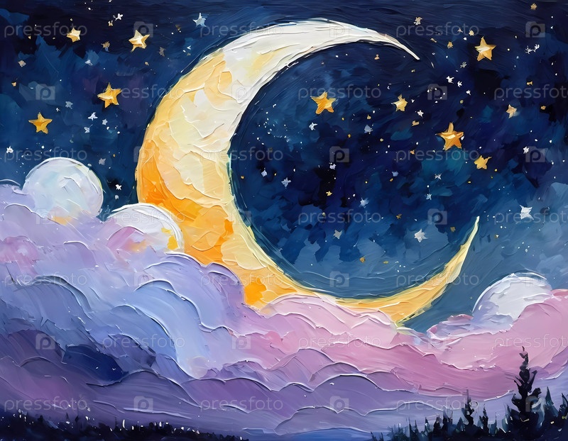 Безмятежное ночное небо с мягким полумесяцем, освещенным пастельными тонами, дополненное облаками и разбросанными звездами. Генеративный ИИ