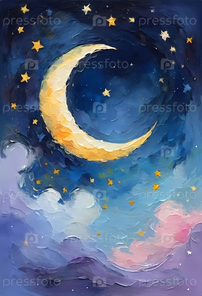 Безмятежное ночное небо с мягким полумесяцем, освещенным пастельными тонами, дополненное облаками и разбросанными звездами. Генеративный ИИ