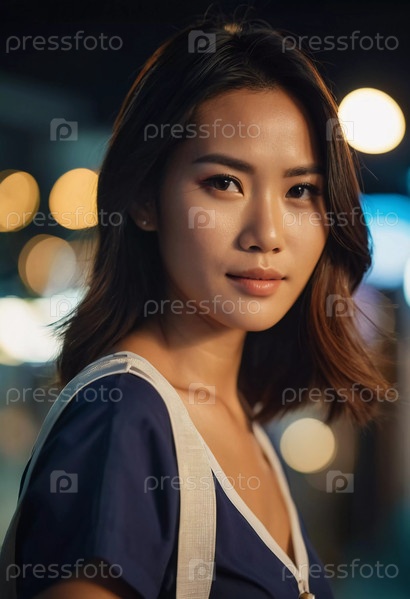 Жительница Таиланда уверенно стоит, демонстрируя свое спокойное поведение и естественную красоту на фоне городских огней. Теплый свет дополняет атмосферу