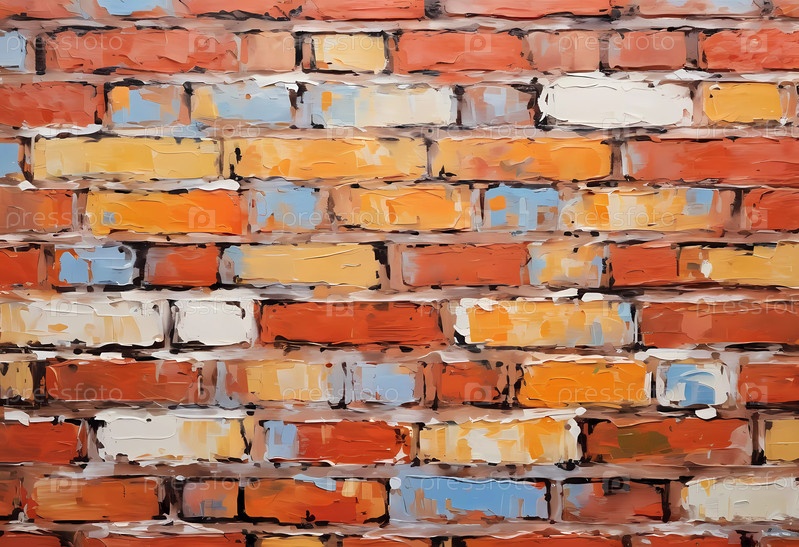 Текстурированная кирпичная стена демонстрирует множество цветов, включая теплые красные, оранжевые и холодные синие оттенки, что добавляет яркости и глубины современному пространству. Генеративный ИИ