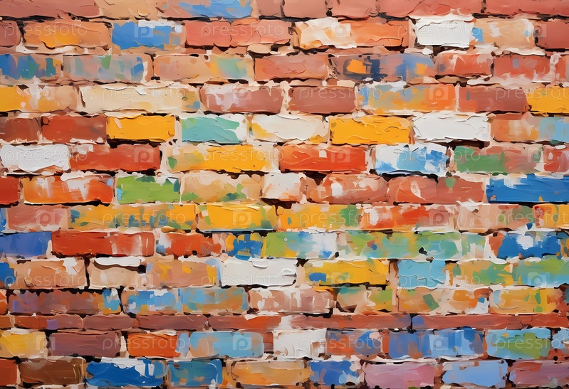 Текстурированная кирпичная стена демонстрирует множество цветов, включая теплые красные, оранжевые и холодные синие оттенки, что добавляет яркости и глубины современному пространству. Генеративный ИИ
