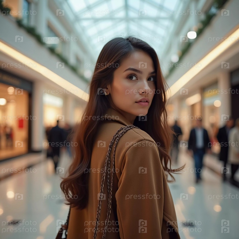 Женщина стоит элегантно в оживленном торговом центре, мимо проходят покупатели, пока она наслаждается своим днем. Современный интерьер и яркий свет усиливают живую атмосферу. Генеративный ИИ