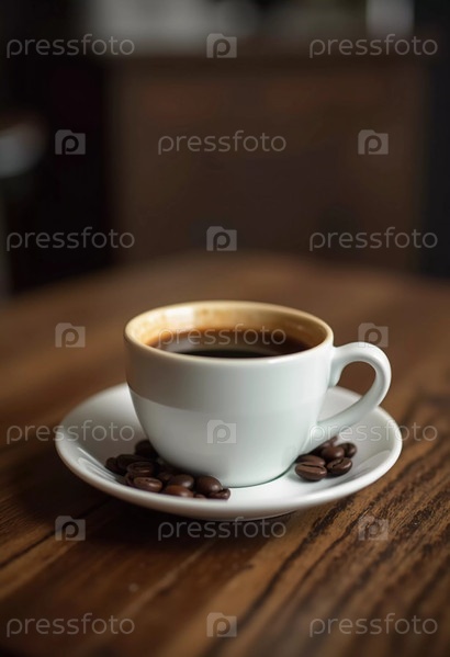 Чашка эспрессо стоит на деревенском деревянном столе, окруженном кофейными зернами, создавая теплую и уютную обстановку, идеально подходящую для наслаждения тихим моментом. Генеративный ИИ