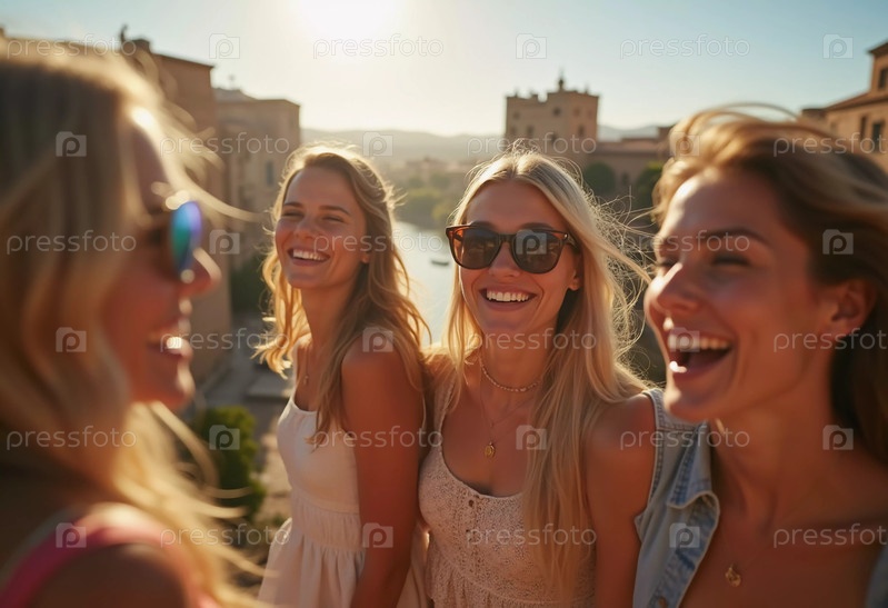 Друзья исследуют очаровательное средиземноморское место, разделяя радостные моменты и смех, греясь на теплом летнем солнце и любуясь потрясающей архитектурой. Красивые молодые девушки. Генеративный ИИ