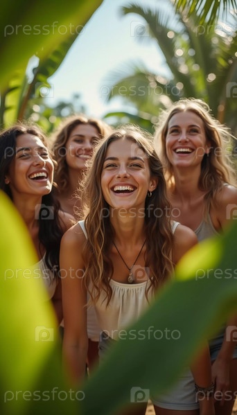 Друзья празднуют летние каникулы в пышной тропической обстановке с смехом и улыбками среди яркой зелени.Тропы это климатические зоны Земли, в которых Солнце находится в зените по крайней мере один раз в год