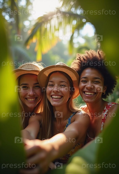 Друзья празднуют летние каникулы в пышной тропической обстановке с смехом и улыбками среди яркой зелени.Тропы это климатические зоны Земли, в которых Солнце находится в зените по крайней мере один раз в год