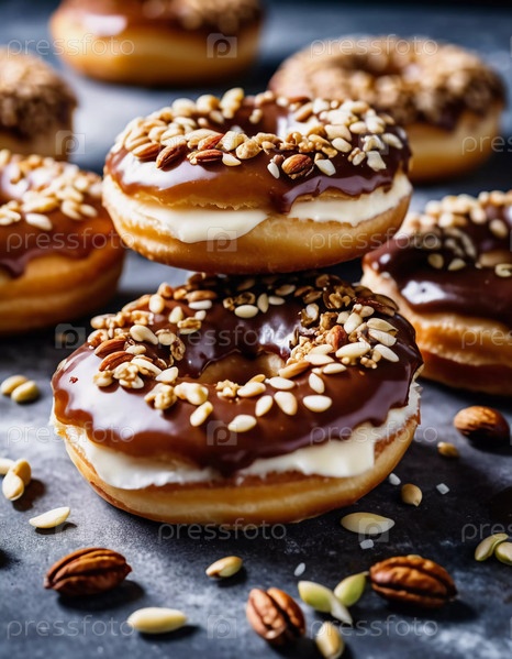 Соблазнительная витрина из пончиков, покрытых шоколадной глазурью и украшенных разнообразными орехами, выставлена на деревенском деревянном столе. Теплое освещение подчеркивает вкусные детали и текстуры угощений. Генеративный ИИ