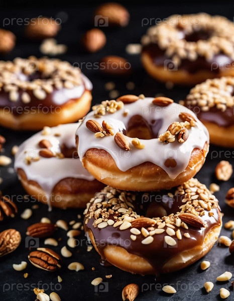 Соблазнительная витрина из пончиков, покрытых шоколадной глазурью и украшенных разнообразными орехами, выставлена на деревенском деревянном столе. Теплое освещение подчеркивает вкусные детали и текстуры угощений. Генеративный ИИ