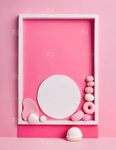 Прямоугольная рамка розового цвета окружает пустое круглое пространство, украшенное разнообразными разноцветными фигурами из пластилина, художественно расположенными по краям. Генеративный ИИ