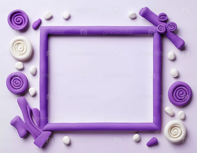 Прямоугольная рамка из фиолетового пластилина окружена белыми и фиолетовыми завитками и фигурами на мягком, светлом фоне. Идеально подходит для художественных экспозиций