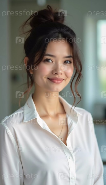 Красивая женщина с темными волосами, одетая в белую рубашку, тепло улыбается, стоя в современном офисе, наполненном естественным светом, излучая уверенность и профессионализм. Генеративный ИИ