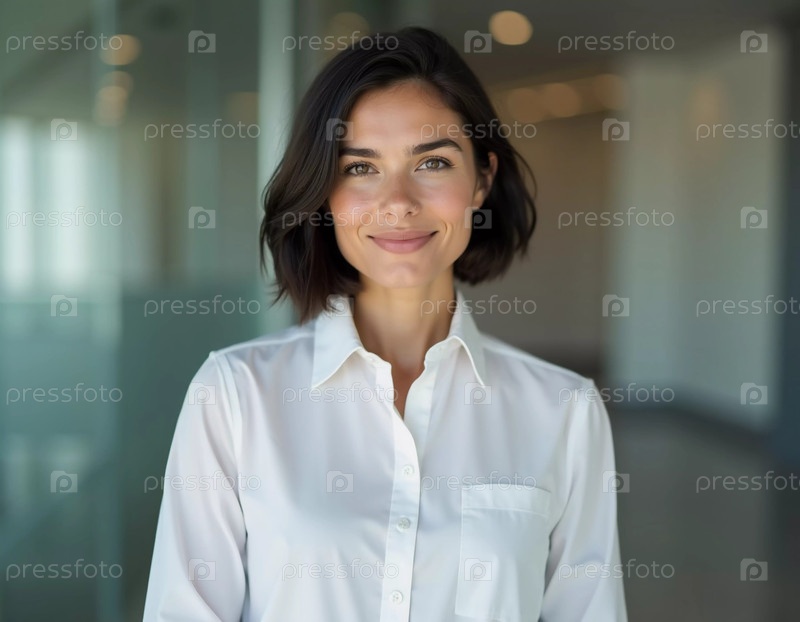 Молодой профессионал в белой рубашке стоит, демонстрируя теплую улыбку в современной офисной обстановке, наполненной мягким рассеянным светом. Симпатичная брюнетка с красивой стрижкой боб. Генеративный ИИ
