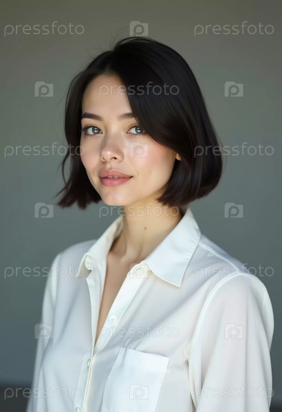 Молодой профессионал в белой рубашке стоит, демонстрируя теплую улыбку в современной офисной обстановке, наполненной мягким рассеянным светом. Симпатичная азиатская брюнетка со стрижкой боб. Генеративный ИИ