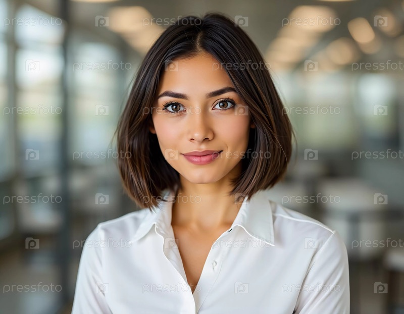 Молодой профессионал в белой рубашке стоит, демонстрируя теплую улыбку в современной офисной обстановке, наполненной мягким рассеянным светом. Симпатичная азиатская брюнетка со стрижкой боб. Генеративный ИИ