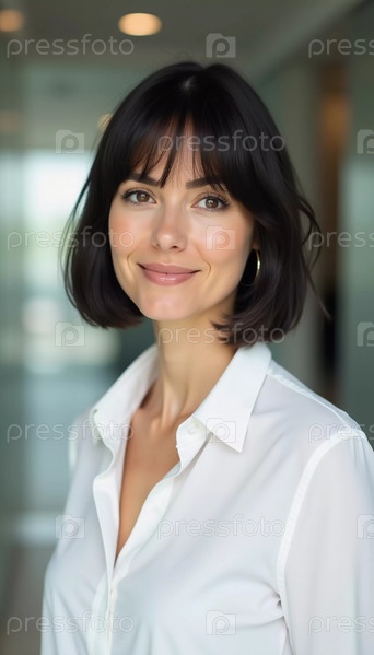 Молодой профессионал в белой рубашке стоит, демонстрируя теплую улыбку в современной офисной обстановке, наполненной мягким рассеянным светом. Симпатичная брюнетка с красивой стрижкой боб. Генеративный ИИ